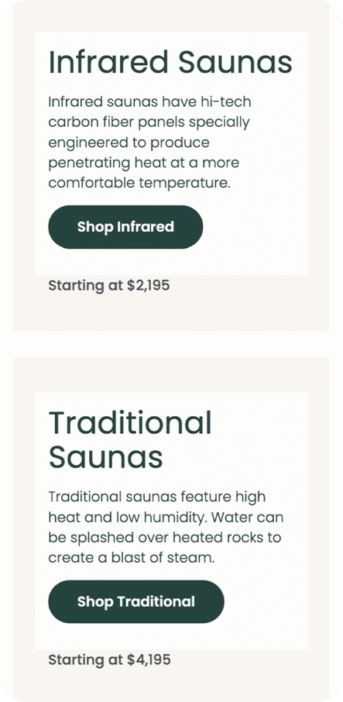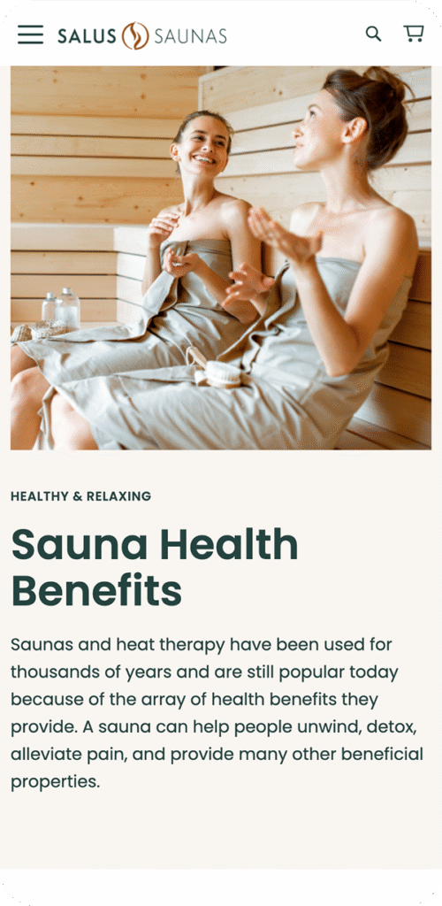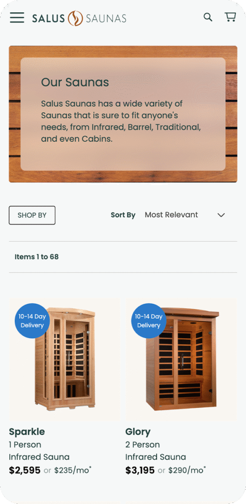 Salus Saunas is a wellness focused company that sells premium saunas and accessories for both indoor and outdoor use. They put an emphasis on the health benefits of regular sauna use and provide a wealth of wellness resources to help consumers find their ideal saunas. We collaborated with them to make it easier for site visitors to find the saunas that fit their needs.